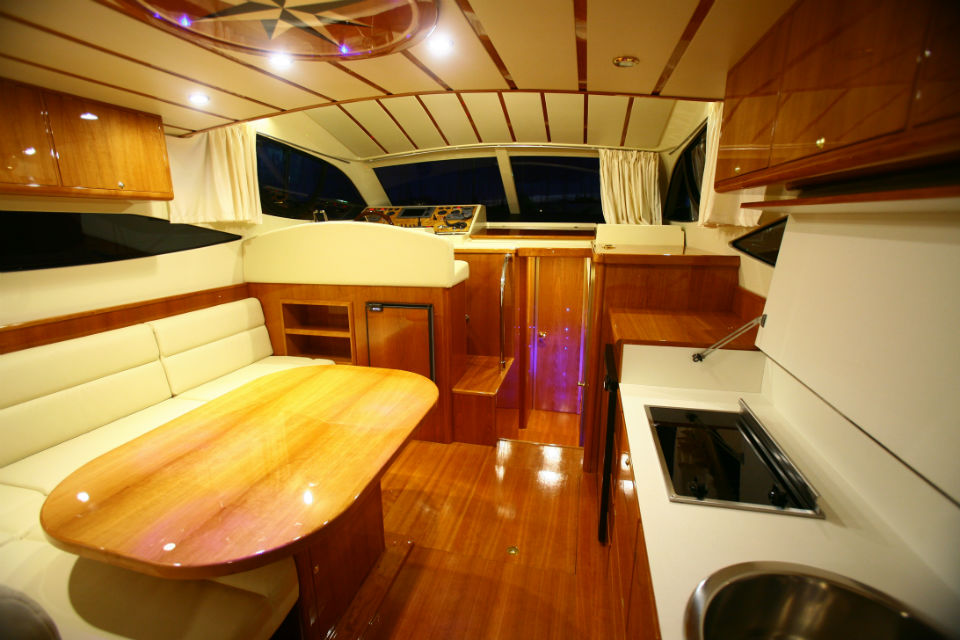Floor with moquette, halogen lights with glass protection, curtains, wooden furniture, fabric or skay sofa, wooden dinner table, no. 2 loudspeakers, steering position, electric boards, stairs to the night-time area, skay ceilings, side walls made of plastic reinforced by incorporated fibreglass , clock and barometer, TV set and socket.